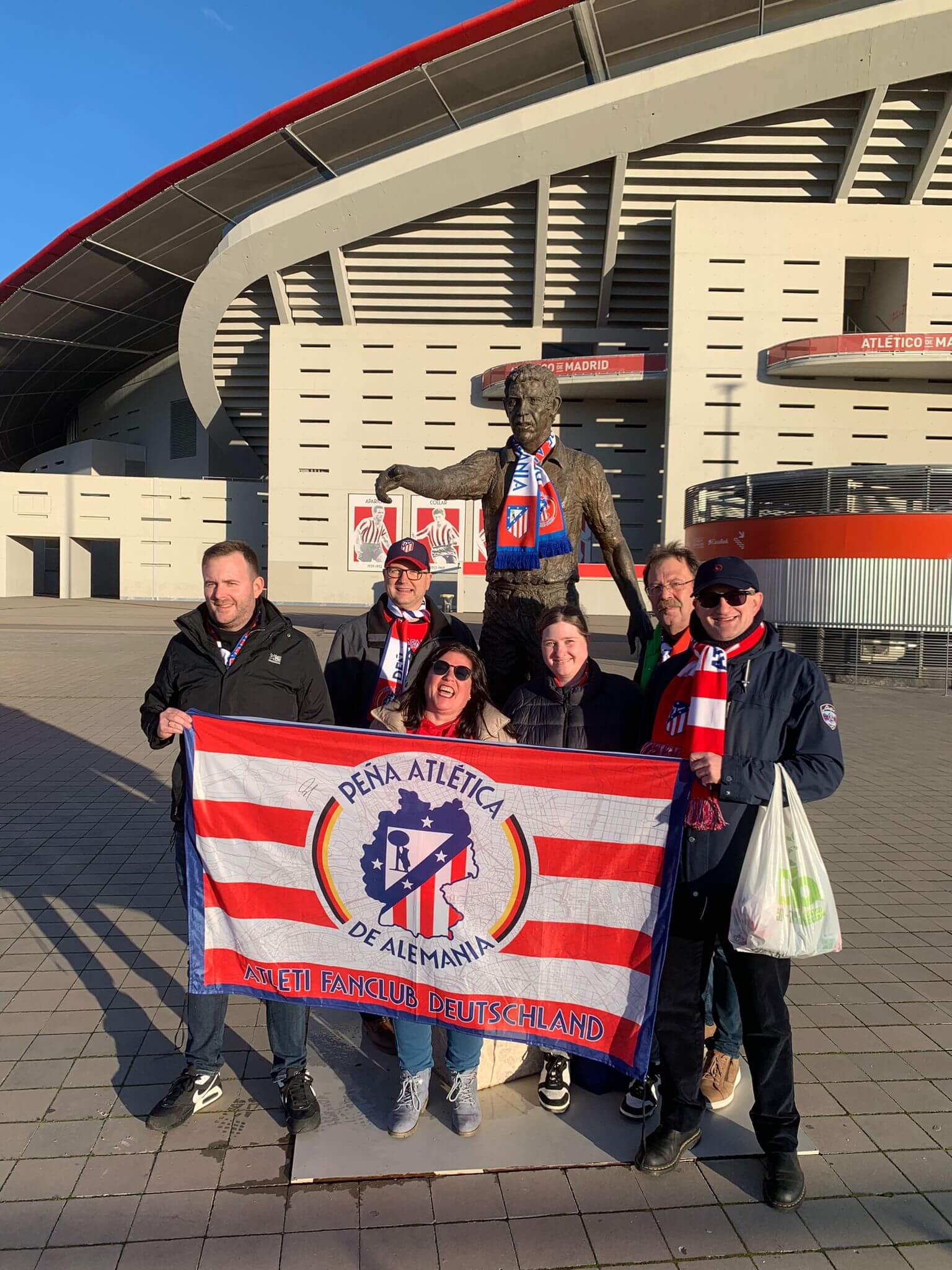Diese tolle Geste kam super an und sofort meldeten sich sieben Mitglieder zu einer spontanen und vor allem lang ersehnten Reise an. Urlaub wurde beantragt, Flüge und Hotels gebucht, und einige trafen bereits am Dienstag, dem 12., ein, die meisten trafen jedoch noch am selben Spieltag, Mittwoch, dem 13., und gingen direkt vom Flughafen zum Stadion. Dort versammelten wir uns und bei etwas Kälte, aber herrlicher Sonne, ging es zunächst darum, die Einrichtungen von außen zu besichtigen. Unser Haus, das Haus aller Colchoneros, lud uns ein, diesen besonderen Tag zu genießen. Fotos, Geschichten, überraschte Gesichter … alles zeigte, dass dies ein unvergesslicher Tag werden würde.