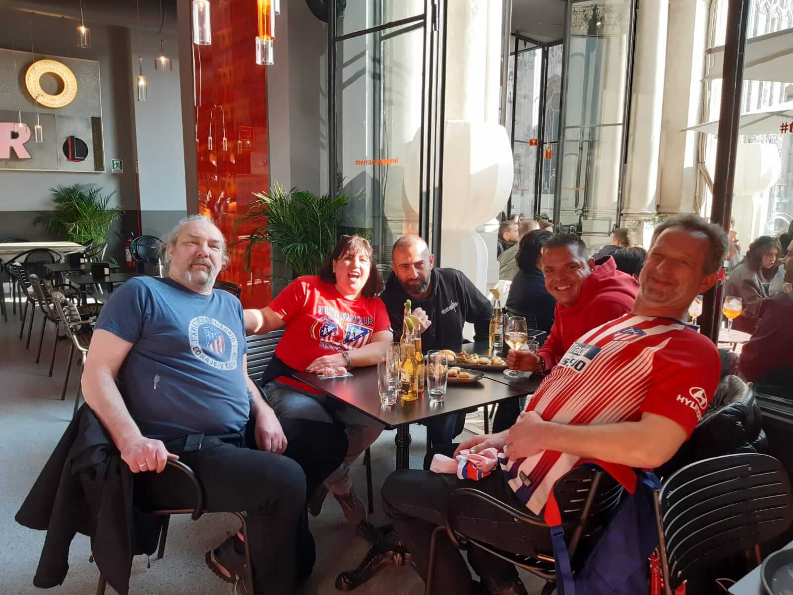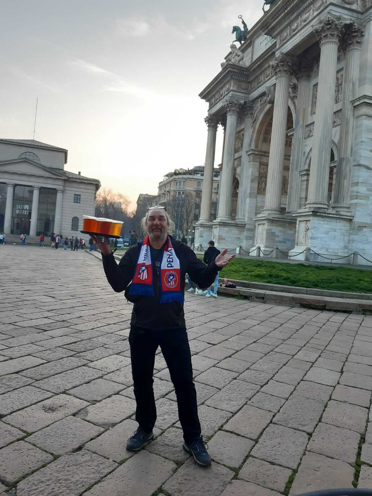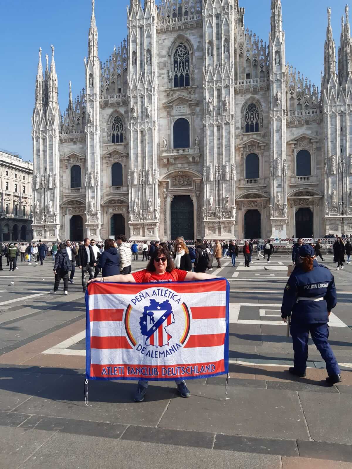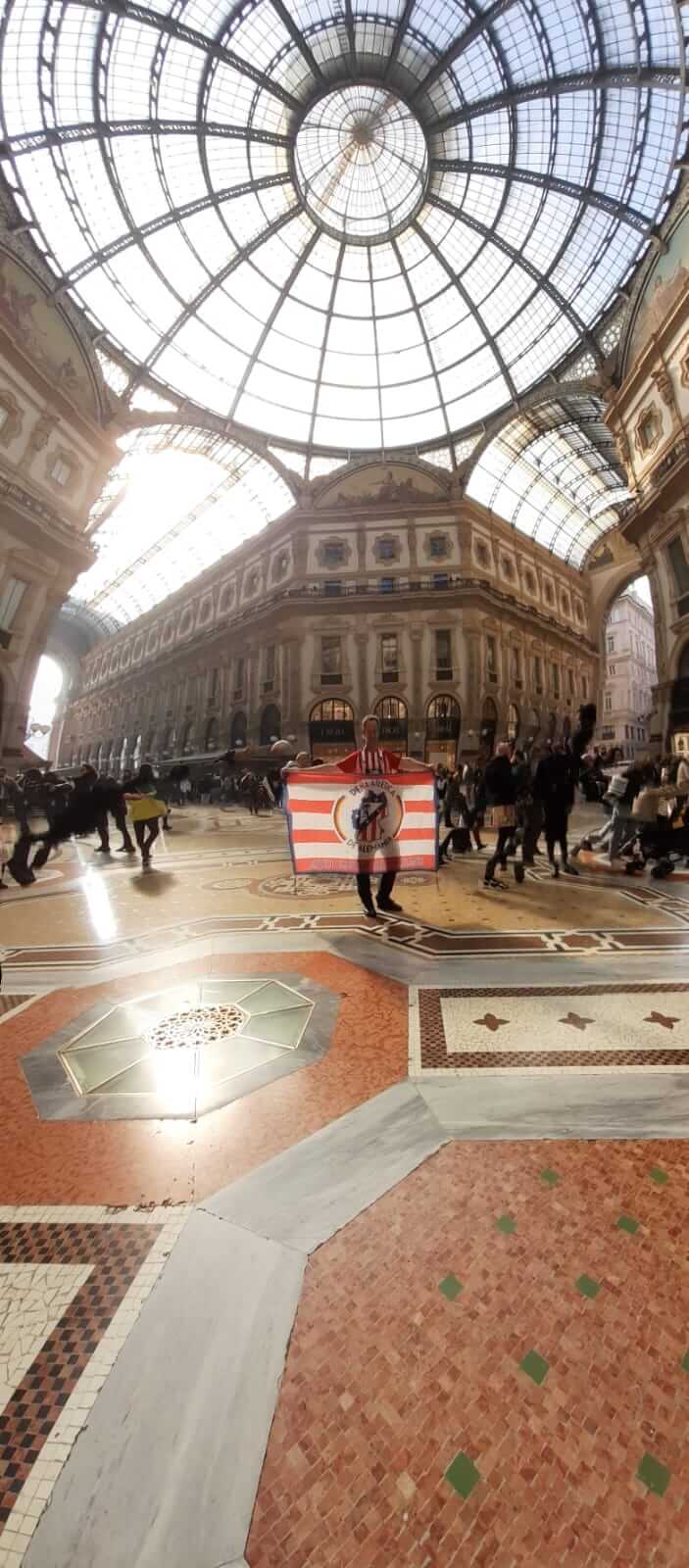 Am Dienstag, den 20., machten wir uns auf den Weg zur Piazza del Duomo. Es war nicht der festgelegte Treffpunkt für Atleti-Fans, aber die Farben Rot und Weiß färbten bereits den meistbesuchten Bereich Mailands. Wir spazierten bei Frühlingswetter durch die Umgebung, bewunderten die sehr teuren Geschäfte und genossen bereits die Atmosphäre. Nach einem Aperitif auf der Terrazza Aperol mit spektakulärer Aussicht beschlossen wir, in einem Restaurant in der angrenzenden Straße zu essen und uns dann auf den Weg zur Piazza della Pace zu machen, dem Treffpunkt und Ausgangspunkt der Marsch.